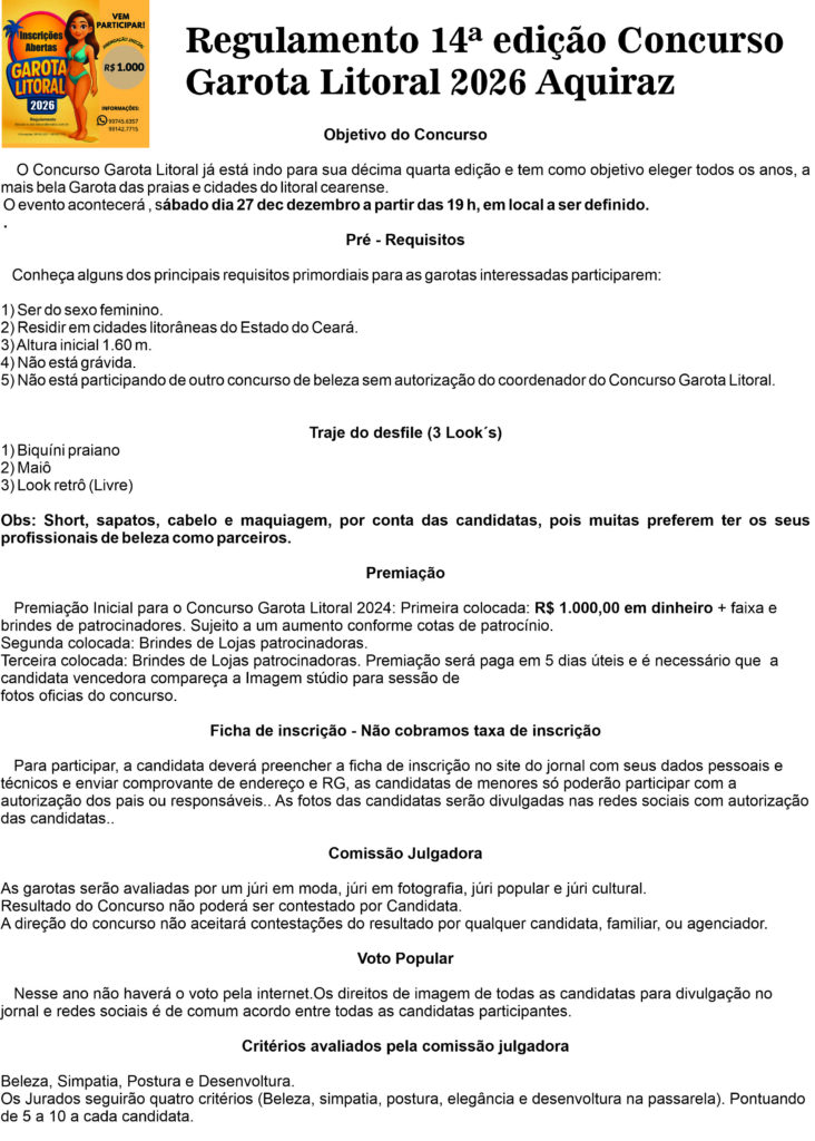 No final desse ano, o Concurso Garota Litoral, evento realizado há mais de 13 anos na cidade de Aquiraz pelo Jornal Tribuna do Litoral, chegará a uma marca histórica de 14 edições consecutivas divulgando a beleza da mulher de Aquiraz e do Ceará.